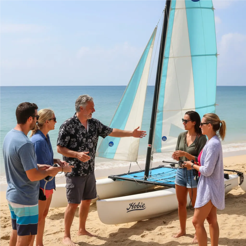 We primarily use Hobie 16 catamarans — fast, fun, and perfect for learning. They’re stable enough for beginners yet exciting enough to keep things interesting.